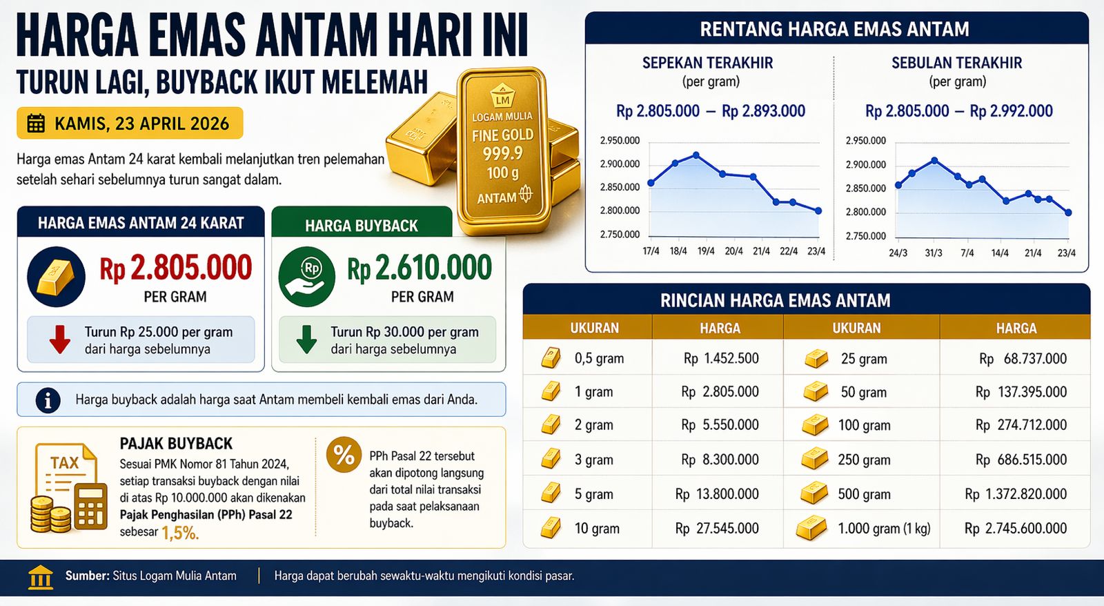 Pada Kamis (23/4/2026), harga emas Antam 24 karat turun Rp 25.000 per gram menjadi Rp 2.805.000 per gram, setelah sebelumnya anjlok Rp 50.000 per gram.
