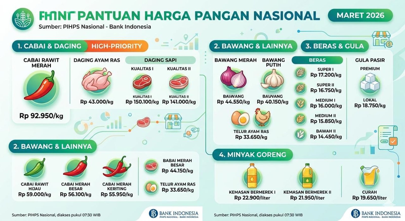 “Pusat Informasi Harga Pangan Strategis (PIHPS) Nasional yang dikelola Bank Indonesia mencatat harga pangan komoditas cabai rawit merah Rp92.950 per kilogram (kg),” tulis pernyataan PIHPS dikutip Rabu (18/3/2026).