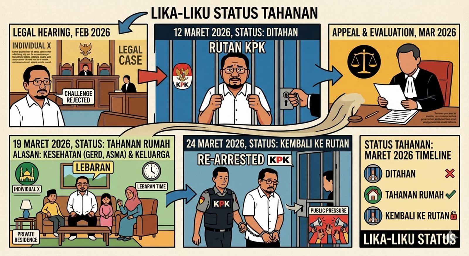 “Proses peralihan tahanan rutan ke tahan rumah dan kembali lagi ke tahanan rutan tidak cukup di jelaskan dengan karena ada permintaan dari keluarga,” kata Abdullah di Jakarta, Selasa (24/3/2026).