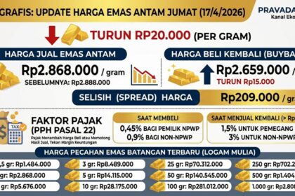 PravadaNews – Harga emas batangan bersertifikat milik PT Aneka Tambang Tbk (ANTAM) kembali terkoreksi pada hari ini, Jumat (17/4/2026). Berdasarkan pembaruan data di situs resmi Logam Mulia, harga emas mengalami penurunan cukup signifikan. Harga emas Antam turun sebesar Rp20.000 per gram. ...